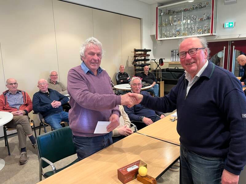 Kampioen Johan van Kuijk wordt gefeliciteerd door voorzitter Harrie Aarts.